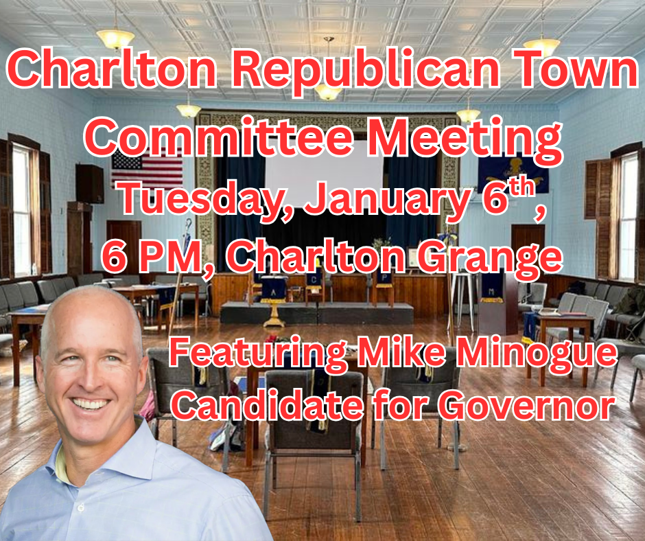 The Charlton Republican Town Committee will be holding our first meeting of the new year at the Charlton Grange on Tuesday, January 6th, 6:00 PM. On the agenda: The imminent special Town Meeting, (make sure you attend!) plans for our 2026 candidate forum, the 2026 town elections, working with nearby RTC’s, and more!