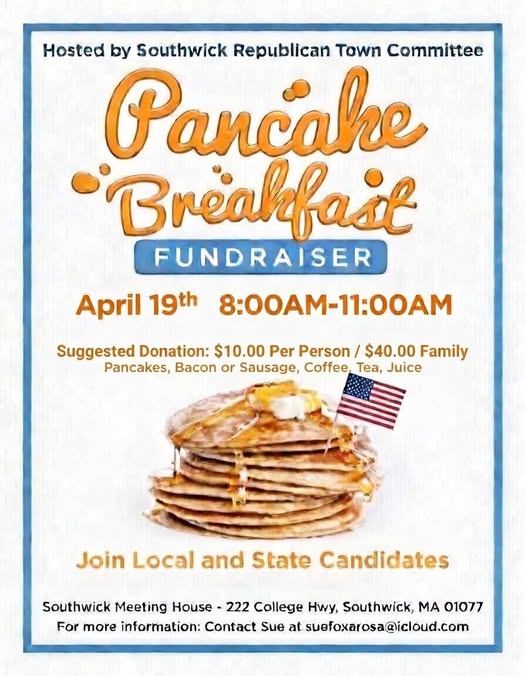 Southwick Republican Town Committee Pancake Breakfast Fundraiser- Homemade Pancakes- Sausage or Bacon- Juice- Coffee- Tea