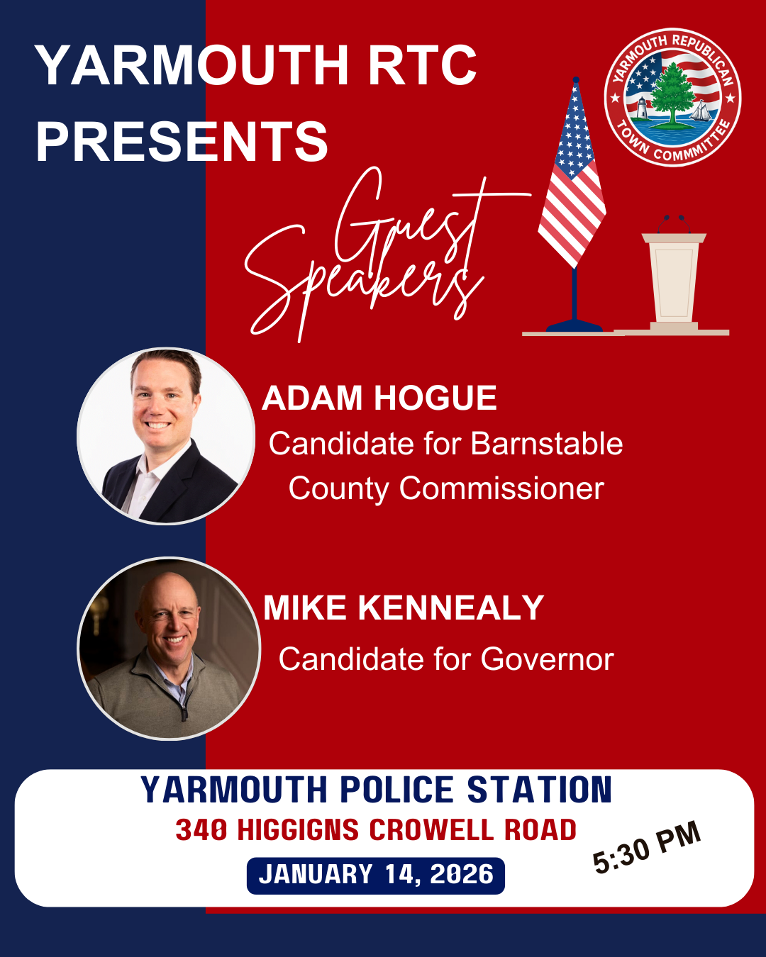 We will be hosting two guest speakers: Mike Kennealy, candidate for MA Governor & Adam Hogue, candidate for Barnstable County Commissioner.